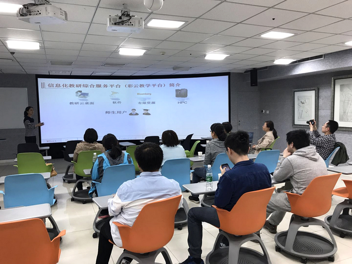 首先我中心新技术研发部王宏伟以国际协作实验室和高清录播互动教室这两间为例,重点介绍了新型教学环境建设和目前高校实际教研需求的关系。然后教室与会议室技术部王利详细介绍了我中心自主研发的彩云教学平台和彩云课堂的主要功能和应用于教学与科研的实际情况。进而双方针对资源环境建设和管理交流了各自学校实际需求的异同和努力方向