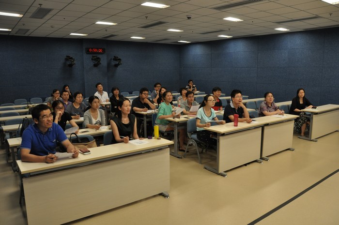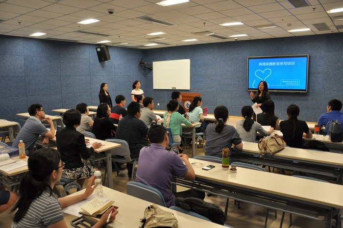 此次培训由教学资源科负责,采用课件介绍和实景演示相结合的方式进行。培训内容主要包括三部分:1.录播教室教师使用注意事项,包括环境设备介绍、授课教师服装、课件、授课区域、动作、声音、师生交互等几方面的要求和建议;2.交互智能平板的应用;3.Prezi简单介绍及作品演示。讲解结束后,教师和中心工作人员就多方面的问题进行了交流,多位教师亲自上讲台体验了录播教室授课。