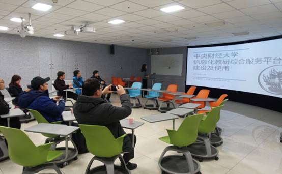 我中心工作人员陪同来访成员参观了学院南路校区的国际协作实验室和高清录播互动教室,与沙河校区多功能互动实验室、智慧教室进行了远程视频连线,逐一介绍了这些新教学环境和教学设备的设计和建设过程、创新特色和使用概况,然后介绍了我中心自主研发的彩云教学平台和彩云课堂的主要功能和应用情况,并解答了来访成员关于教学环境设计和功能实现方面的一些具体问题。