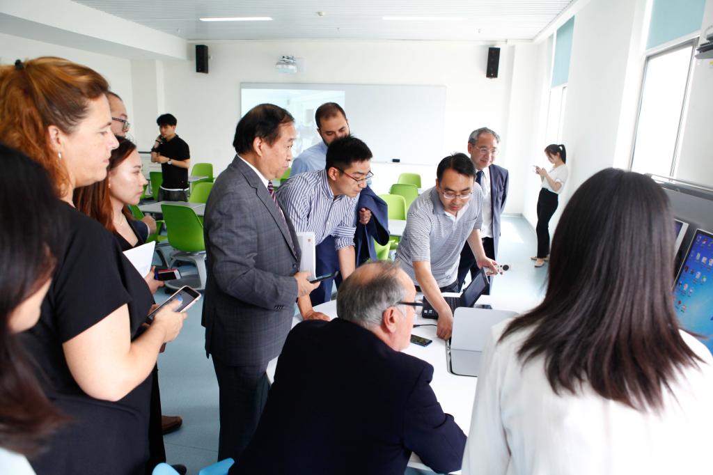 专家一行来到实验楼308的国际协作实验室,中心主任王健向认证专家介绍了实验室功能和用途,对国际协作实验室配备的远程视频会议系统进行了演示,并与中财大厦大数据教学科研实验室进行了连线。在多功能互动实验室,了解了我中心自行研发的彩云教研平台,就互相关心的问题进行了交流。最后,专家一行在中财大厦大数据教学科研实验室,中心王宏伟介绍智慧黑板、移动会议终端以及多功能互动实验台,并观看了智慧白板的使用演示。