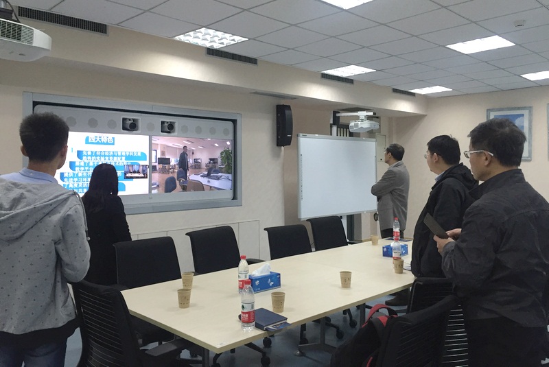 2017年4月25日下午,上海海关学院科技处处长吴江、教务处副处长王轶凡、海管系副主任梁大忠、教务处助理实验师张麒一行四人来我中心参观交流。中心主任王健介绍了中心实验室建设概况,实验中心白学清介绍了彩云教学教学平台的主要功能以及在实验教学中的应用,双方就我校彩云教学平台建设、云桌面应用情况、特色实验室建设和使用等方面进行了交流和探讨。
