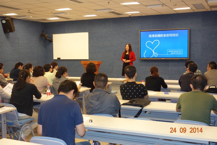 我校第一间高清录播教室本学期正式投入使用,为更好地利用录播教室,保证录课质量,教学技术服务中心于9月24日下午在沙河校区6号楼107高清录播教室组织了首次使用培训。报名参加23人,实际参加培训的有来自保险学院、会计学院、统计与数学学院、财政学院、金融学院、教师教学发展中心及国际经济与贸易学院等7个单位的19位教师。