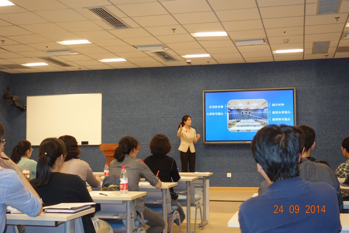 中心主任王键老师首先对高清录播教室的建设背景及特色进行了介绍,本次培训由教学资源科主要负责,首先简单介绍了高清录播教室的环境设备,然后详细讲解了录课前对于服装、课件的要求,以及录课中对教师授课区域、动作、声音、师生交互等几方面的建议。此次培训安排在录播教室实际环境中进行,采用课件介绍和实景演示相结合的方式进行。讲解结束后,教师和中心工作人员就多方面的问题进行了交流,多位教师亲自上讲台体验了录播教室授课。